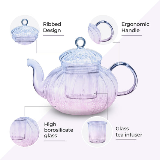 Ribbed Borosilicate Two Tone Blue & Pink Glass Teapot 1000ml