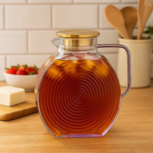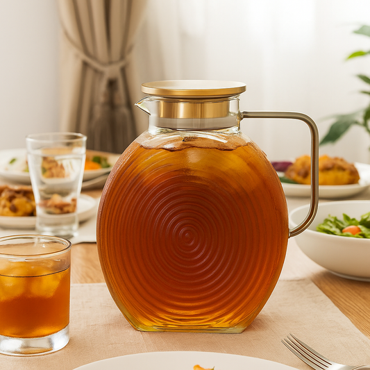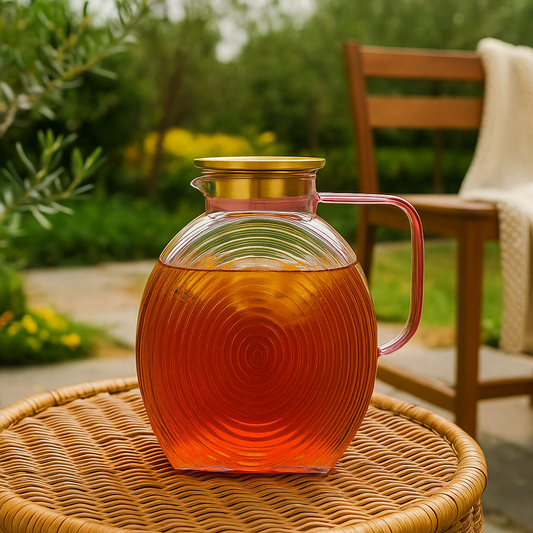 Serve in style with our new collection of ribbed borosilicate glass pitchers. Featuring a striking ribbed texture, gold-accented lids, and ergonomic handles, they’re perfect for pouring everything from iced teas to infused waters - whether you're hosting a brunch or just treating yourself.